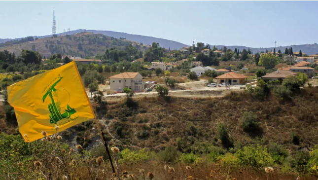 Hezbollah flag rising above a lebanese village.