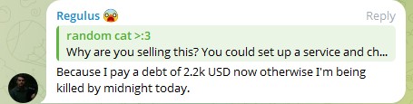 “Admin has in hands the source code for a system that links the famous XMR (Monero) with the banking system, especially instant payment systems—which has already been tested with considerably large amounts of money with success for more than 8 months in a row—which I would like to sell for practical reasons. …The price of such is 0.20 BTC | 80 XMR (Sadly, bargaining isn’t an option). If interested, please contact: @reguluz”