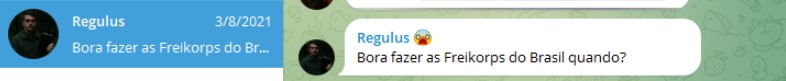 [149727 on 2021-03-08 19:07]: “Bora fazer as Freikorps do Brasil quando?” — (Portuguese) “When are we going to form Brazil’s Freikorps?” — suggests creating a Brazilian version of the Freikorps (far-right paramilitary units), a clear neo-Nazi LARP by a Brazilian.
